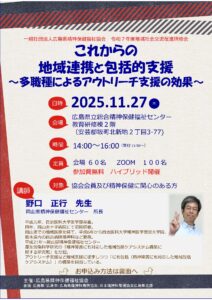 一般社団法人広島県精神保健福祉協会主催で以下の研修が実施されます。