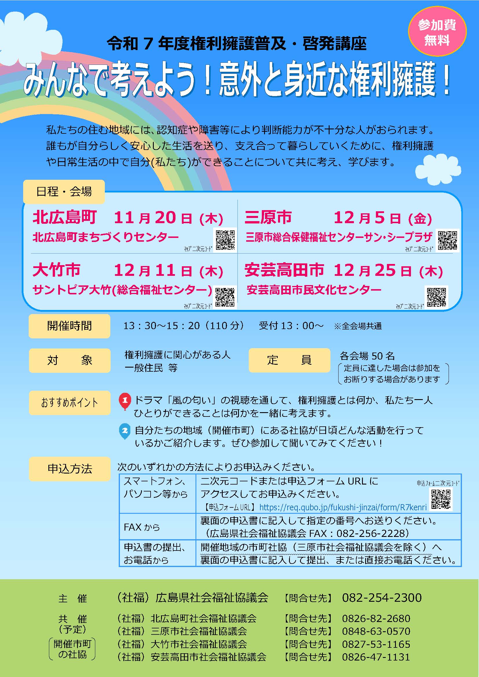 広島県社会福祉協議会では、令和7年度「権利擁護普及・啓発講座~みんなで考えよう!意外と身近な権利擁護!~」を県内4会場で開催します。